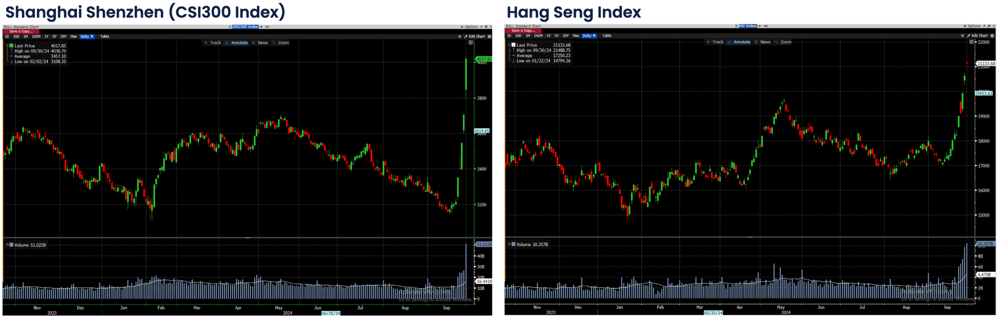 - Market Reaction Before National Day (1/10/2024): Optimism surged ahead of the holiday, with the CSI300 up 23.4% and the Hang Seng Index rising 15.8% in just five trading days.